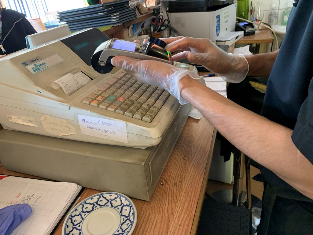 Myös maksupäätettä käsitellään suojakäsineet kädessä